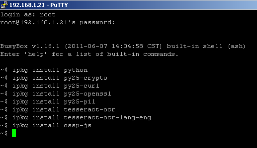 Ci colleghiamo da Ssh, e instaleramos pacchetti "python", py25-crypto, py25-curl, py25-openssl, py25-pil, Tesseract ocr, ipercubo-ocr-lang-ita, OSSP js" con i comandi :